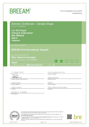 We are very pleased to inform you that we have received the BREEAM 2010 International Bespoke Design Certificate for Lot Rmeil 1031.